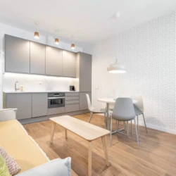 Det fullt utrustade köket inkluderar ugn, mikrovågsugn och diskmaskin. Lägenheten har central luftkonditionering och uppvärmning i alla rum, samt tvättmaskin och torktumlare tillgängligt vid längre vistelser, vilket möjliggör ett smidigt och bekymmersfritt boende.