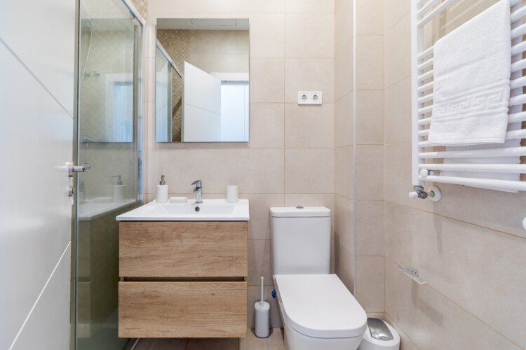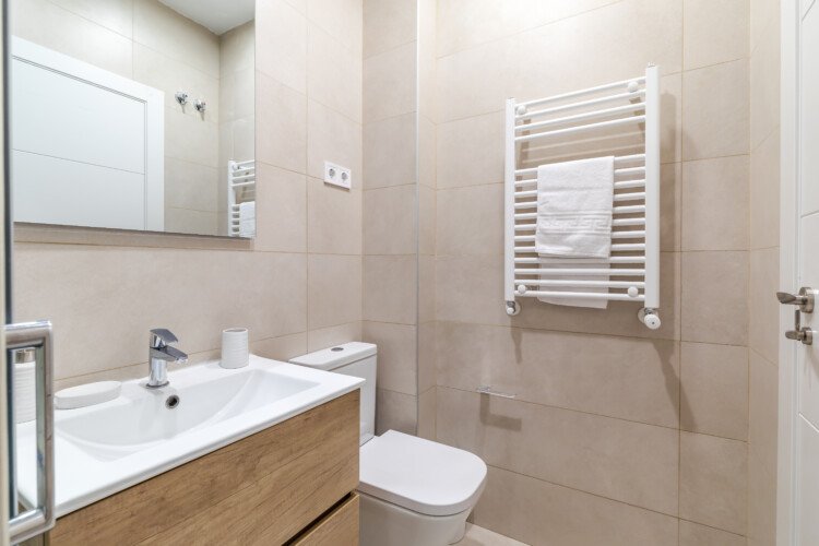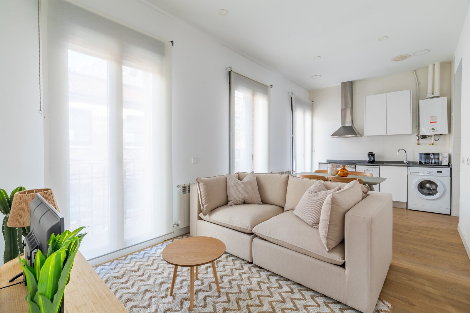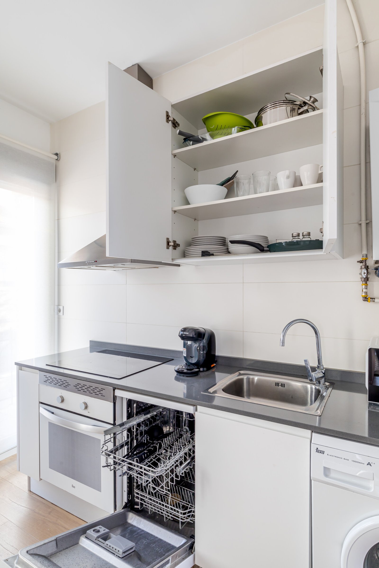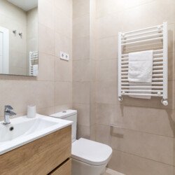 Det fullt utrustade köket inkluderar ugn, mikrovågsugn och diskmaskin. Bostaden har central luftkonditionering och uppvärmning i alla rum, samt tvättmaskin och torktumlare tillgängligt vid längre vistelser.