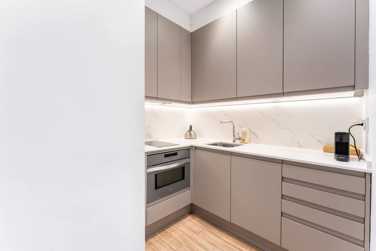 Det fullt utrustade köket inkluderar ugn, mikrovågsugn och diskmaskin. Lägenheten har central luftkonditionering och uppvärmning i alla rum, samt tvättmaskin och torktumlare tillgängligt vid längre vistelser, vilket säkerställer ett bekymmersfritt boende.