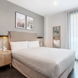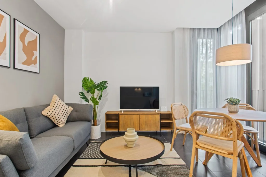 Upptäck Poblenou från denna ljusa och moderna 75 m² stora lägenhet. Med ett sovrum med dubbelsäng och ett med enkelsäng är den perfekt för professionella resenärer eller små familjer som söker ett bekvämt hem i Barcelona.